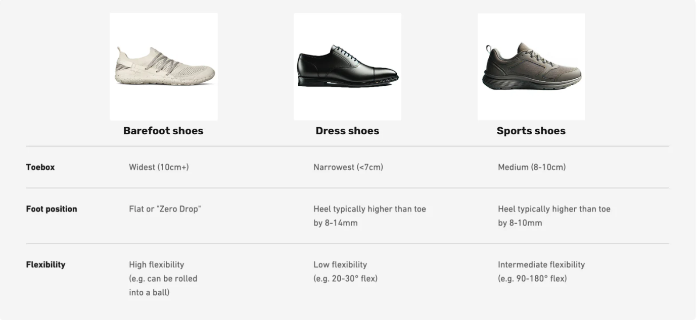 Giày truyền thống làm thay đổi cách chân tiếp đất, lâu dài khiến cơ chân yếu đi và giảm cảm giác. Điều này có thể dẫn đến các vấn đề như bunion (lệch ngón cái), ngón chân búa, và tăng nguy cơ chấn thương khi lớn tuổi. - Vật liệu không tối ưu: